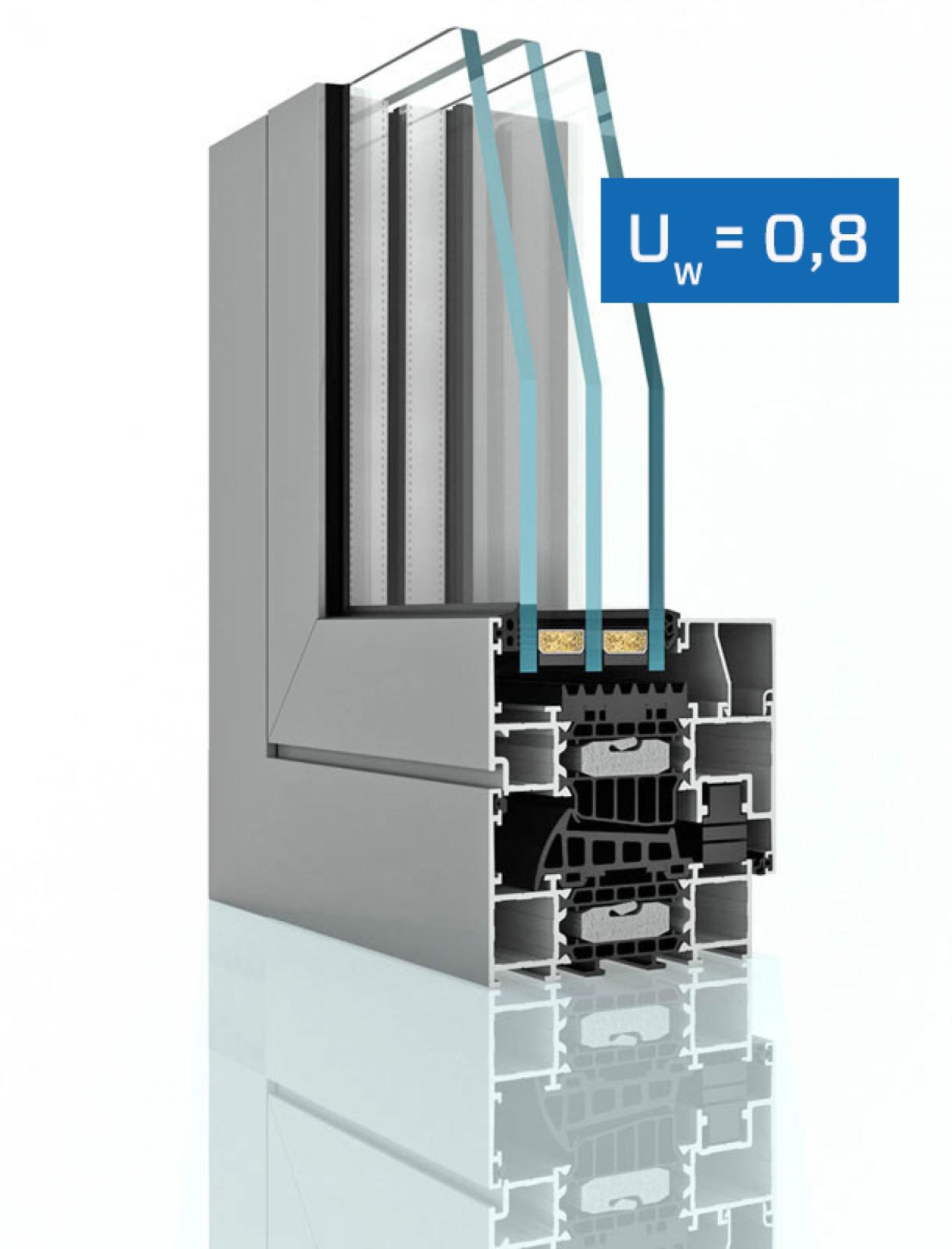 Cette menuiserie aluminium répond aux exigences de la construction très basse consommation, Uw: 0,8 W/m²K.